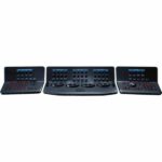 Le Blackmagic Design DaVinci Resolve Advanced Panel se compose d’une console principale et de deux consoles auxiliaires, une de chaque côté, ainsi que d’un clavier dans la console centrale.