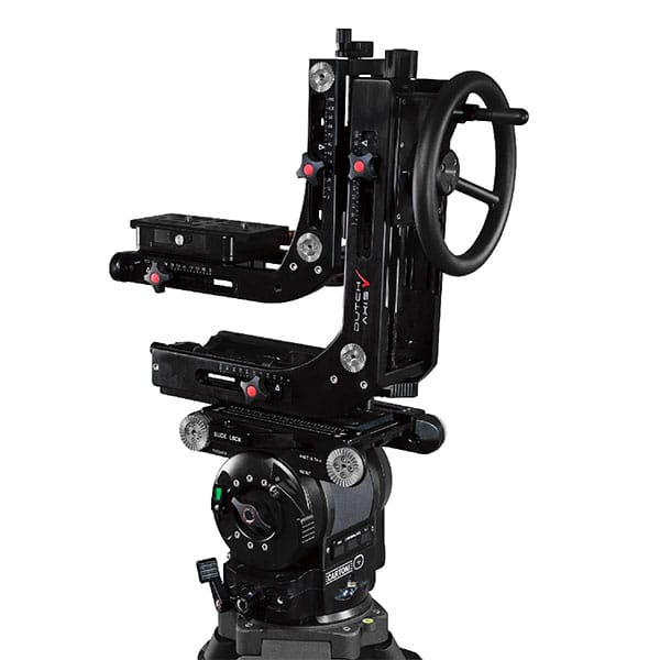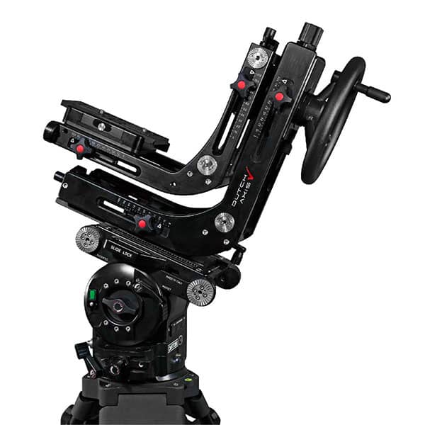 Cartoni Total Dutch permet d’ajouter un 3ème axe de rotation latérale à n’importe quelle tête classique heayvy duty pan and tilt et qui permet une extraordinaire rotation de 360°. La rotation est dirigée par un volant percé au centre pour le passage de câble.Deux contrepoids d’1 Kg complètent l’ensemble de l’équipement pour une véritable rotation nodale autour du centre optique. La tête Total Dutch prête à être installé sur toutes les têtes grâce à deux vis de 3/8″.