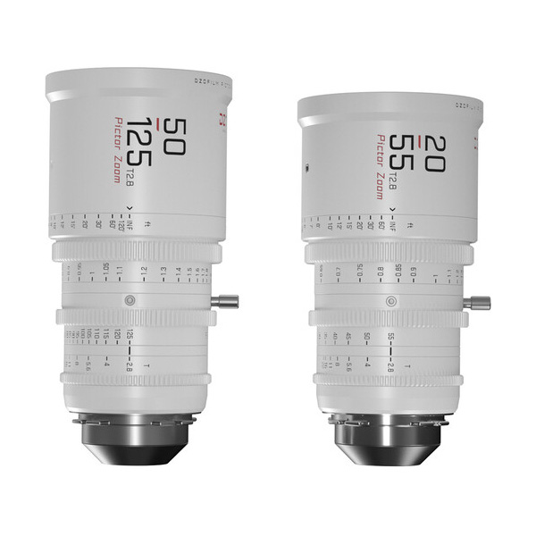 Le kit d’objectifs Dzofilm 20-55mm et 50-125mm se compose de deux objectifs avec une finition blanche standard. Les objectifs offrent une couverture d’une plage de zoom étendue avec une ouverture maximale relativement rapide. Les deux couvrent les capteurs Super35 et ont des longueurs, un poids, des positions d’engrenage d’objectif et un diamètre extérieur avant similaires, ce qui permet un échange d’objectif rapide.