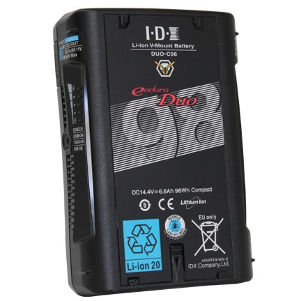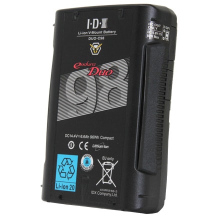 La batterie IDX DUO-C98P a une capacité de 97Wh et est capable d’une sortie maximale de 115W (à 10,4A 11V). Grâce à l’utilisation de cellules présentant un bon rapport puissance-capacité-volume, on obtient 97Wh avec une épaisseur de seulement 39 mm. Elle est idéale pour les prises de vue avec stabilisateurs (montage V) + moniteurs (D-Tap) et pour les systèmes de couverture tels que caméscopes (montage V) + éclairage (D-Tap).