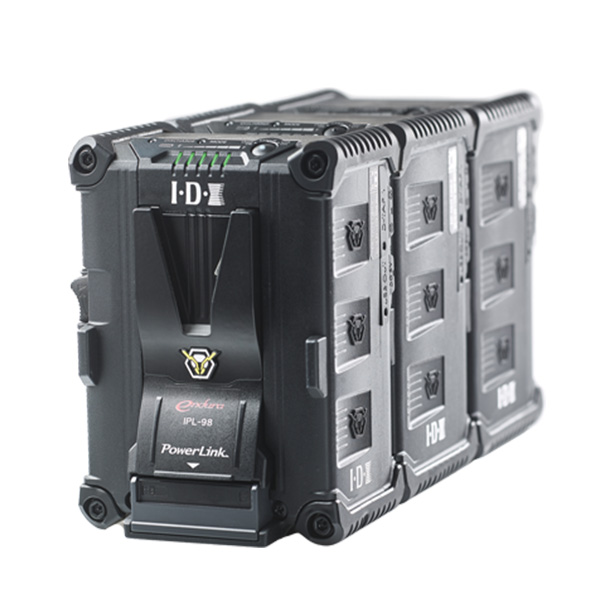 Comme la célèbre IDX E-HL9, les batteries de la série IPL peuvent supporter des charges importantes. PowerLink vous permet de connecter jusqu’à quatre batteries IPL-98 / IPL-150 via les standards de la monture V-Mount. Cette fonctionnalité permet également d’utiliser une quatrième batterie V-Mount d’une marque autre que IDX, ce qui est pratique pour ceux qui possèdent déjà certains produits.