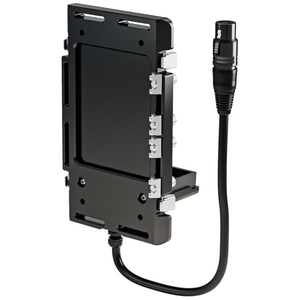 Se fixant directement sur l’appareil, placez votre batterie sur la plaque, fixez le couvercle et alimentez via un câble XLR moulé.
