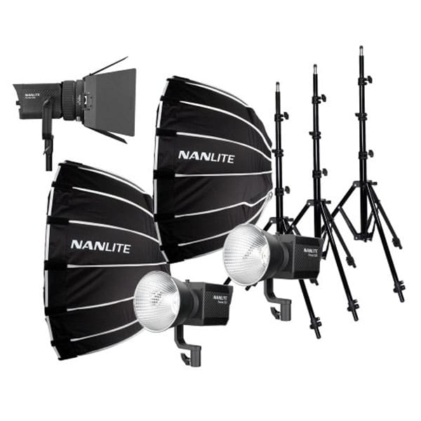 Le Nanlite Forza 150 Triple Kit intègre 3 projecteurs LED Nanlite Forza 150, 3 pieds studio lumière, 3 grandes boîtes à lumière rectangulaire 90x60cm et 3 réflecteurs.