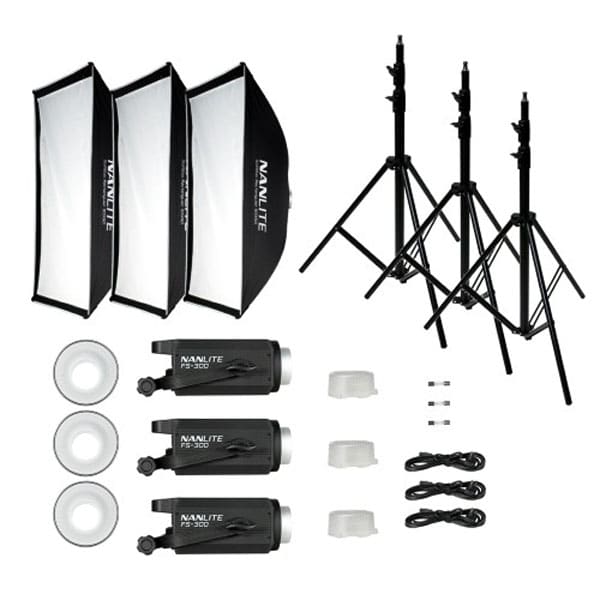 Le Nanlite FS-300 Triple Kit intègre 3 projecteurs LED Nanlite FS300, 3 pieds studio lumière, 3 softbox rectangulaires 60×90 cm et sac de transport.