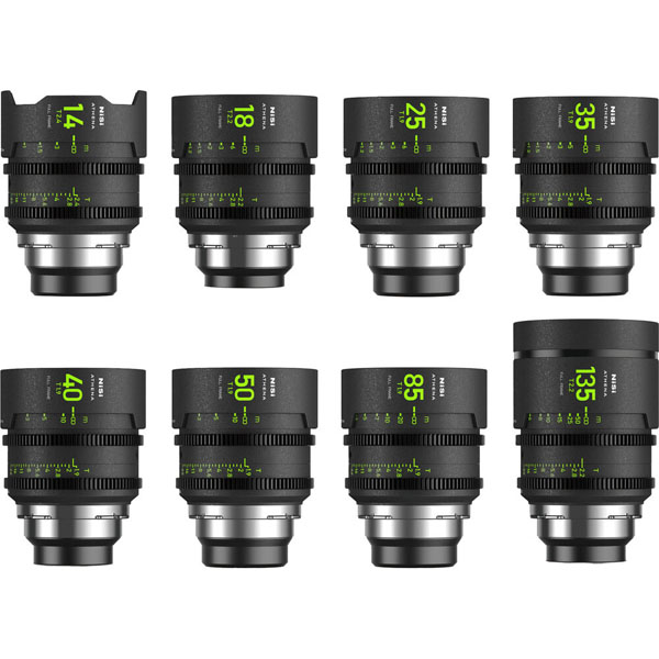 Le Nisi Athena Master Kit est un série d’objectifs cinéma qui couvre différentes focales, compatibles avec les caméras plein format. L’objectif de 14 mm offre une ouverture de T2,4, tandis que ceux de 18 et 135 mm s’ouvrent à T2,2 et les objectifs de 25, 35, 40, 50 et 85 mm à T1,9. Tous partagent un diamètre frontal de 80 mm, un cercle d’image de 46 mm et des bagues crantées de 0,8 MOD, assurant l’uniformité à travers les focales. Cela facilite l’utilisation d’un système de follow focus commun et réduit les ajustements lors du changement d’objectifs.