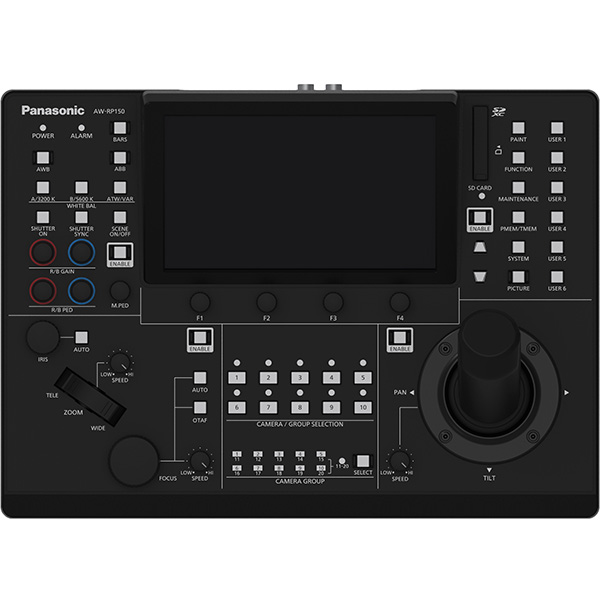 Le Panasonic AW-RP150 est le dernier contrôleur de caméra à distance qui complète la gamme de caméras PTZ professionnelles de la marque. Ce contrôleur présente les mêmes fonctionnalités que les AW-RP120 et AW-RP50 tout en apportant des améliorations significatives par rapport à ces modèles, dont une nouvelle manette permettant une utilisation d’une seule main (pour le contrôle PTZ ou la mise au point) et un grand écran LCD tactile pour les commandes et le paramétrage des menus.
