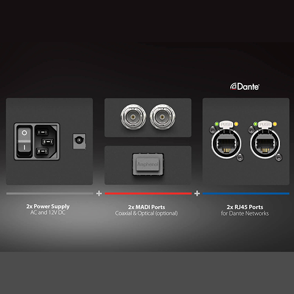 En plus de Dante, le 12Mic-D dispose de deux ports MADI distincts (coaxial intégré en standard et MADI optique disponible via un module SFP en option), de trois sorties ADAT et d’une sortie casque de niveau ligne pour le contrôle de tous les signaux numériques et analogiques entrants. Grâce à une matrice de routage, chacun des 204 canaux d’entrée du 12Mic-D peut être acheminé individuellement vers l’un des 218 canaux de sortie.
