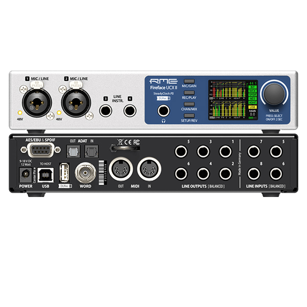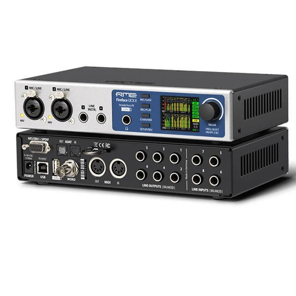 La Fireface UCX II comporte deux préamplis micro/ligne en configuration combo XLR sur le panneau avant, ainsi que deux entrées ligne/instrument contrôlées numériquement, suivies d’une prise casque, de divers boutons de contrôle, d’un écran et du bouton de volume principal. À l’arrière, on trouve un ensemble de dix entrées et sorties analogiques symétriques, des E/S MIDI, des E/S ADAT, des E/S AES/EBU et SPDIF, l’USB 2.0 ainsi qu’une E/S word clock commutable.