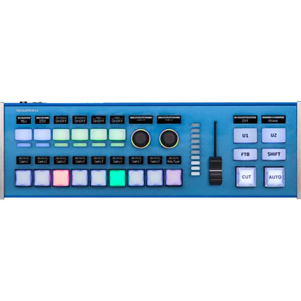 Le SKAARHOJ Live Fly avec NKK est une surface de contrôle qui vous permet d’exécuter vos productions jusqu’à 8 caméras. Il intègre neuf boutons programmables à quatre voies avec écrans OLED, six boutons audio à quatre voies avec des LED de mesure RVB à plusieurs niveaux et écrans OLED, deux boutons d’encodeur avec écrans OLED, un fader de transition avec une barre de LED RVB et un ME section avec changement de vitesse et touches utilisateur à plusieurs niveaux et deux écrans OLED. La technologie PoE simplifie la configuration en permettant aux signaux et à l’alimentation de circuler via un seul câble.