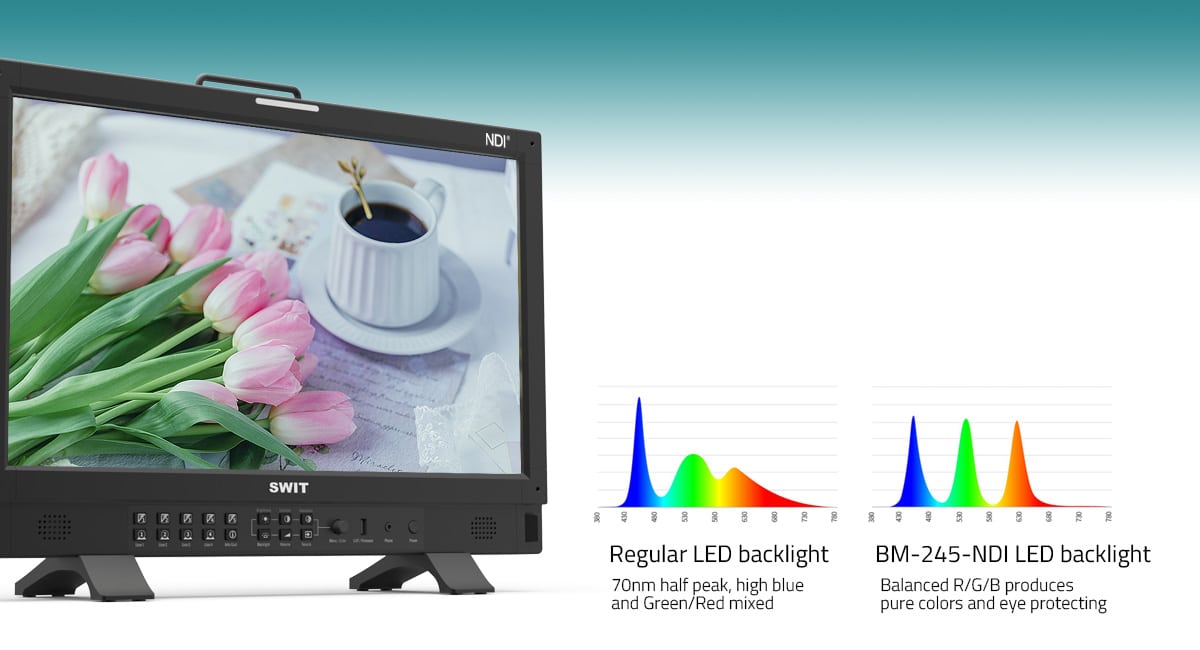 Le SWIT BM-245-NDI – Moniteur 23.8″ 4K est l’un des derniers modèle de la gamme de moniteur NDI chez SWIT. Ce modèle NDI possède une surprenante qualité d’image. Son panneau QLED a une résolution maximale de 1920×1080 et les angles de vision sont assez larges, avec notamment un angle de 178° H/V et un rapport de contraste de 1000:1.