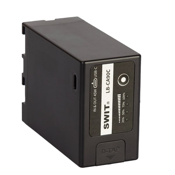 Swit LB-CA90C 90Wh est une batterie compatible Canon BP-A de 90 Wh avec sortie D-tap et entrée/sortie USB-C de 45 W, pour les Canon EOS C70, C200, C300MK2, C500MK2, XF605, XF705. La batterie LB-CA90C se compose de 8 cellules de batterie, d’une tension nominale de 14,4 V, d’une grande capacité de 90 Wh/6200 mAh pour maintenir les caméras sous tension plus longtemps. La charge de puissance constante est de 50W/4A. La batterie LB-CA90C BP-A fournit une prise de courant D-tap de tension 11-16,8 V, charge 50 W/4 A. Vous pouvez également charger la batterie via la prise D-tap.