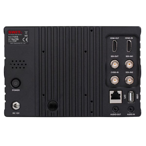 Le moniteur SWIT S-1073F adopte un panneau LCD TFT 7 . L’écran LCD offre une résolution de 1920 x 1200 et un angle de vision large de 160 °. Il dispose de deux entrées 3G-SDI (niveau A / B), une HDMI et une entrée CVBS. Il comprend également une sortie SDI (boucle SDI via la sortie / HDMI converti en sortie SDI), HDMI et audio pour casque et haut-parleur.
