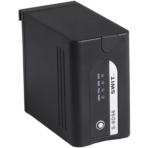 La puissance maximale est de 30W pour la charge d’autre équipements de la caméra (éclairage). La batterie S-8D98 dispose d’un indicateur d’alimentation LED à 4 niveaux pour vérifier rapidement la capacité restante de la batterie avant utilisation. Le S-8D98 peut être chargé sur un chargeur Panasonic DE-A88 et prendra environ 6 heures pour se recharger complètement.