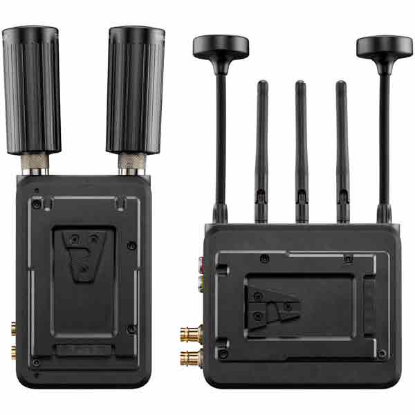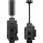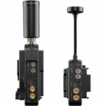 L’unité est alimentée par une entrée CC à 2 broches ou par la plaque de batterie V-Mount incluse, et des filetages de montage 1/4″-20 et M3 permettent de monter votre émetteur sur une variété de caméras, de cages ou de rigs.