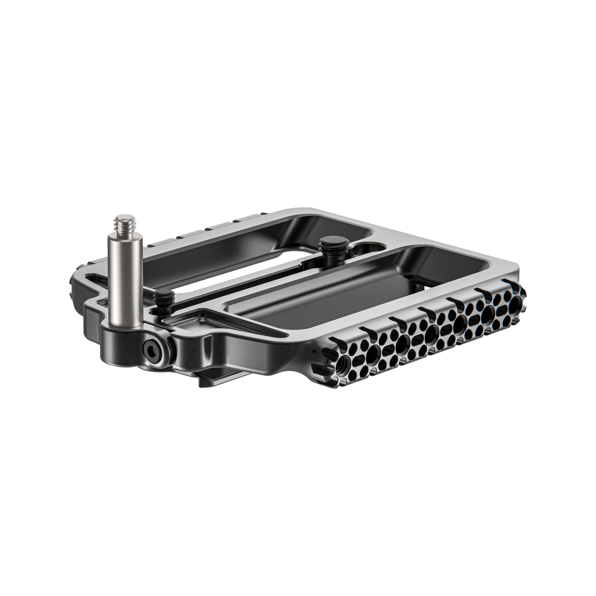 L’ARCA Riser Plate inclut une tige de support d’adaptateur de lentille qui empêche la monture de l’objectif de se tordre lors du changement d’objectifs. Cette tige comprend un rail coulissant réglable permettant d’ajuster la position de la caméra pour s’adapter au choix de l’adaptateur de monture d’objectif, comme l’adaptateur RF vers PL Mount. Avec 14 points de montage ¼”-20 le long du bas, l’ARCA Riser Plate permet l’ajout d’accessoires tels que l’ARCA Shoulder Plate et la Steadicam Plate sans nécessiter une Bridge Plate. Notez que la Base Plate est nécessaire pour les systèmes de trépied ou de Bridge Plate.